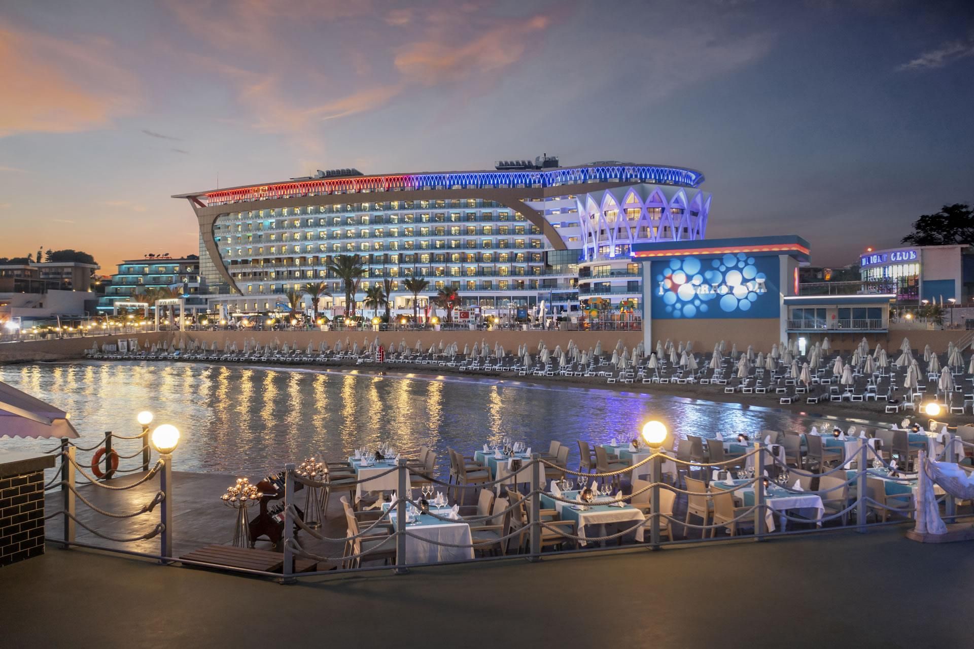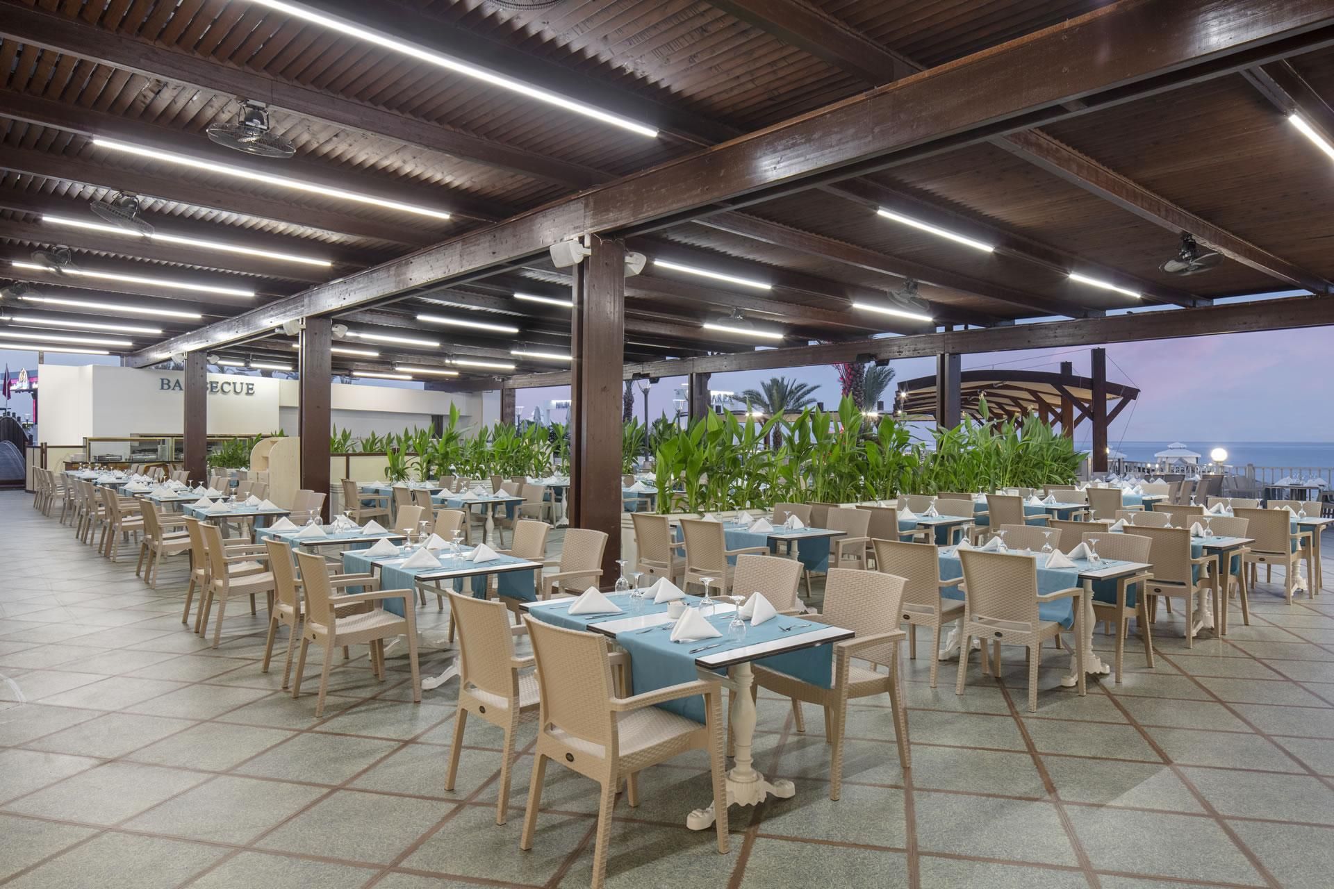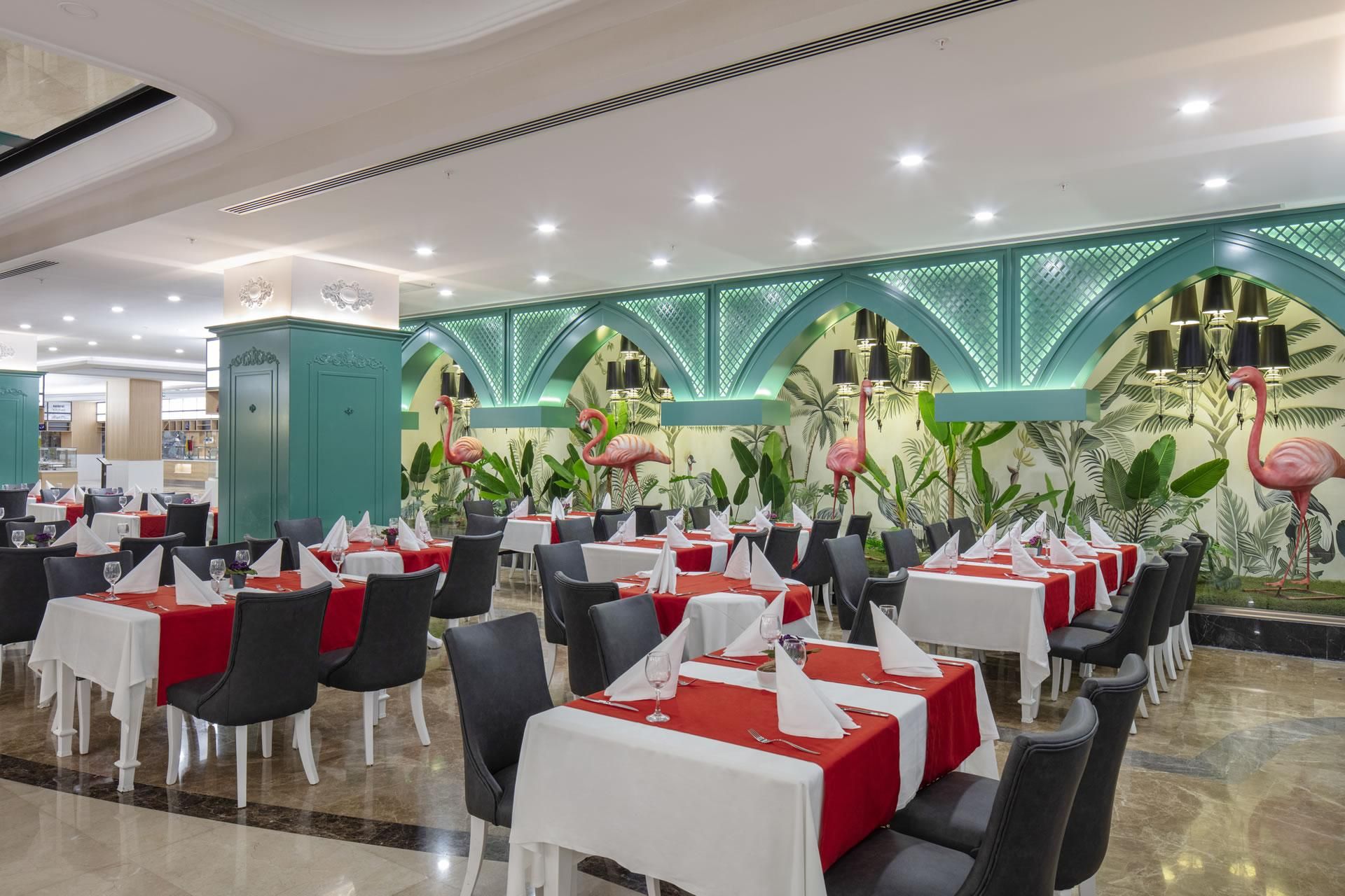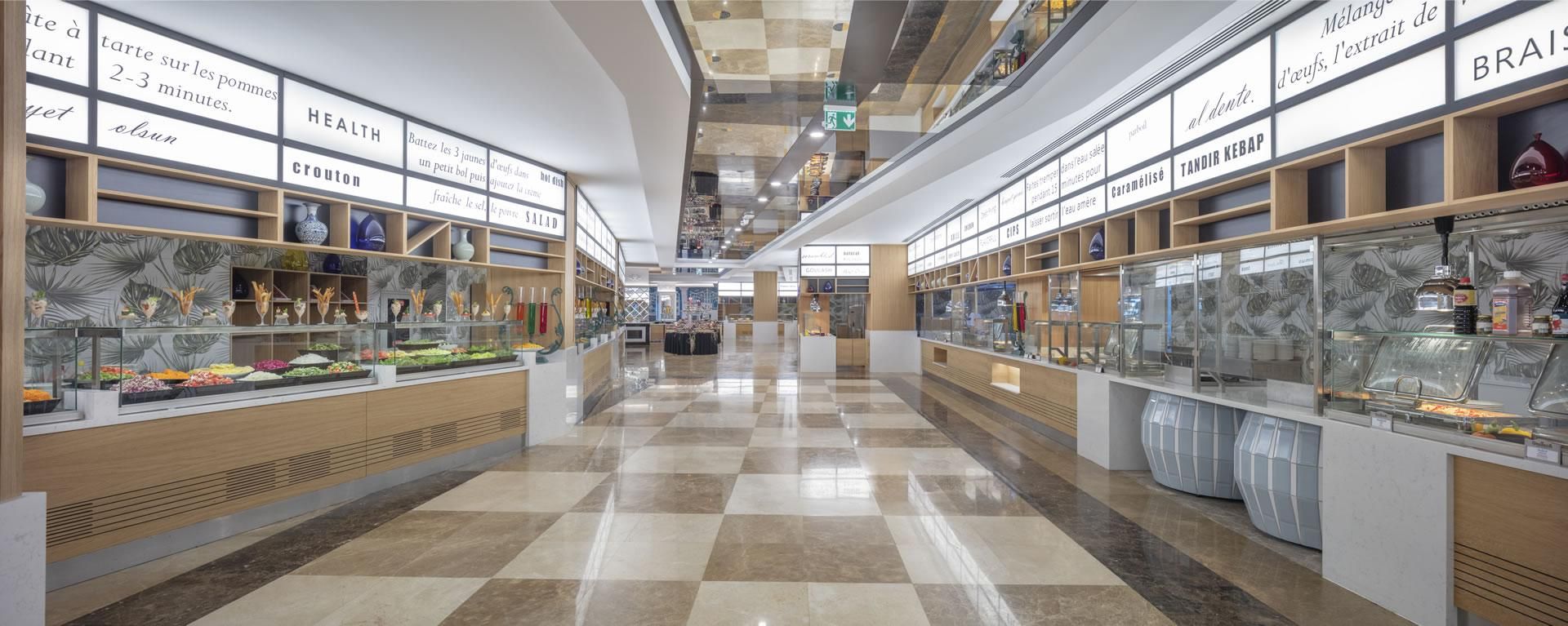 Ultra Her Şey Dahil konsept ile hizmet veren tesiste açık büfe servisi olan ana restoran dışında, 4 adet a la carte restoran bulunuyor. Öğle ve akşam yemeklerinde diyet ve vejetaryen lezzetler de sunuluyor.